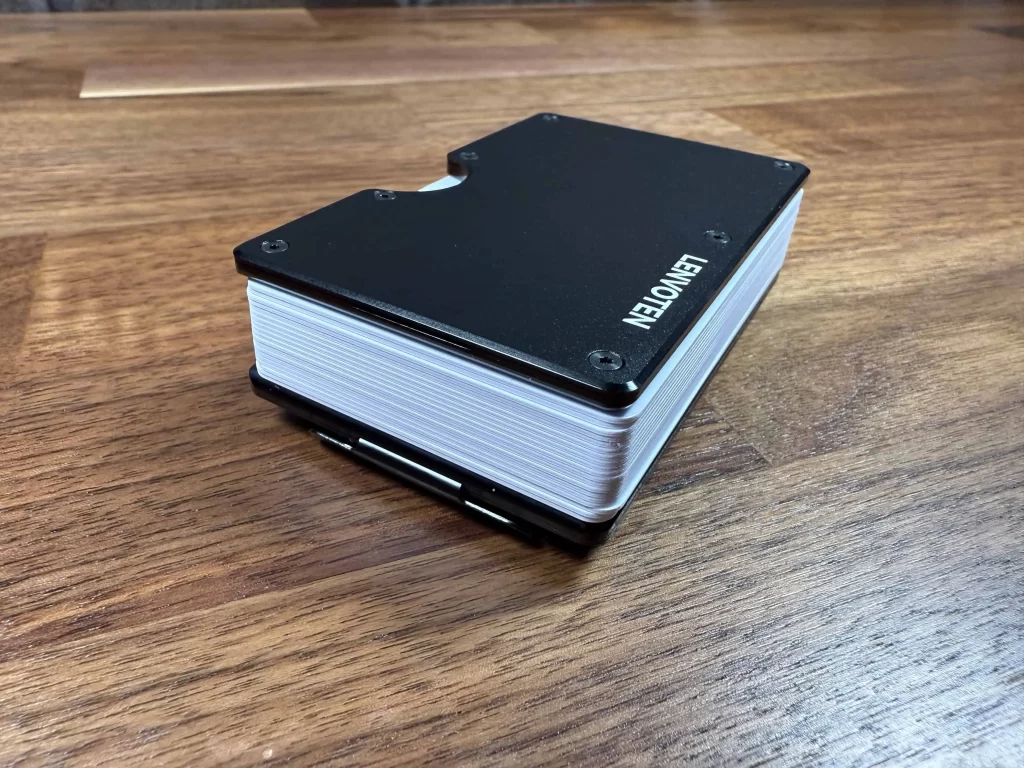The wallet itself is nearly identical in build. The size is identical, the function is identical, the number of screws is identical. The only major differences I can see are the money clip,the spot where you push up the cards, and the strange mechanism they use for extending the wallet. There’s no elastic band, which the Ridge also uses to protect the shorter sides of the card, only exposing one side to where cards can slide out. The top and side of the Lenvoten are open, which does make it easier to remove cards but I also feel could leave the cards open to damage unless you align them all yourself.